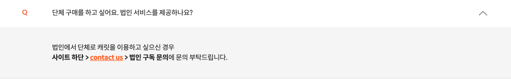 캐릿의 내부데이터를 살펴볼 수 없어 실제 법인 구독의 수요가 있는지, 법인 구독 시 사람들이 자주 문의하는 사항에는 어떤 것들이 있는지 홈페이지의 FAQ를 살펴보았습니다. FAQ의 질문은 곧 고객이 구매 전 궁금해하는(혹은 아쉬워하는) 사항들이며, 이 지점들을 해소해 주었을 때 구매로 이어질 확률이 높아질 것이라 생각했기 때문입니다. 아래는 캐릿의 FAQ에서 발췌한 질문들입니다.