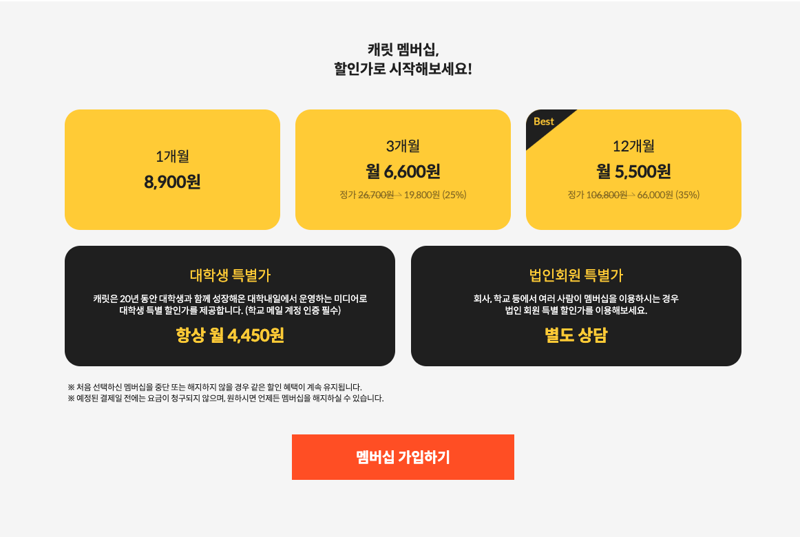 먼저 A/B테스트를 통해 바꾸어보고자 하는 부분은 아래와 같습니다. 현재 캐릿의 랜딩페이지 중 법인 회원 구매를 유도하는 부분은 아래와 같은데요, 단순히 '여러 사람이 멤버십을 이용할 경우 법인 회원 특별가로 구매할 수 있다'는 정보 외에 법인 회원의 구매 담당자를 후킹할 만한 요소는 없어 보입니다.