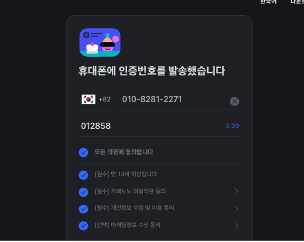 위 화면은 #5867FF 색상을 제거한 화면의 모습이다. 인증번호 받기, 휴대폰, 회원가입의 버튼 색이 사라진 것을 확인할 수 있다.