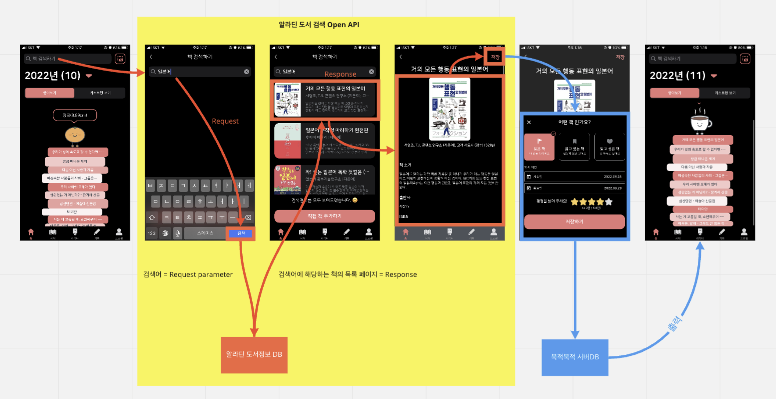 API를 간략하게 설명하자면, '이미 구현된 프로세스를 가져와 사용하는 것'입니다. 위의 예시에서는 책 검색에 해당하는 프로세스를 API로 개발할 수 있을 것 같습니다. 직접 위의 과정을 모두 구현하지 않아도 네이버, 카카오, 알라딘 등에서 제공하는 책 검색 API, 즉 이미 구현된 책 검색 프로세스를 가져와 내 서비스에 붙일 수 있는 것이죠. 오늘은 9월 28일자에서 다뤄보았던 북적북적과 알라딘 책 검색 API를 조금 더 디벨롭시켜 API를 통해 무엇을 주고받는지 알아보고자 합니다.