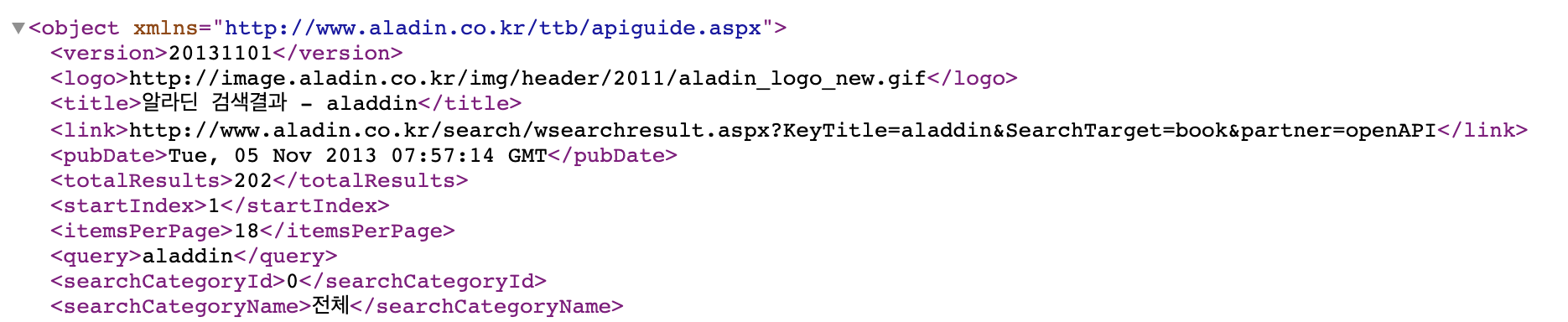 위의 상세 기술 문서에 따라 응답 페이지를 살펴보면, 해당 응답 결과는 20131101ver API를 사용한 응답 결과이며, API 결과의 제목은 알라딘 검색결과 - aladdin , API 응답 페이지와 관련된 URL 주소는 http://www.aladin.co.kr/search/wsearchresult.aspx?KeyTitle=aladdin&SearchTarget=book&partner=openAPI, API 응답 페이지(해당 페이지)가 출력된 날짜는 2013년 11월 5일, 총 검색 결과 수는 203건, 페이지 수는 1페이지, 한 페이지에 18개의 책 출력, 조회한 쿼리(검색어)는 aladdin, 조회 카테고리는 전체(0)로 볼 수 있습니다.