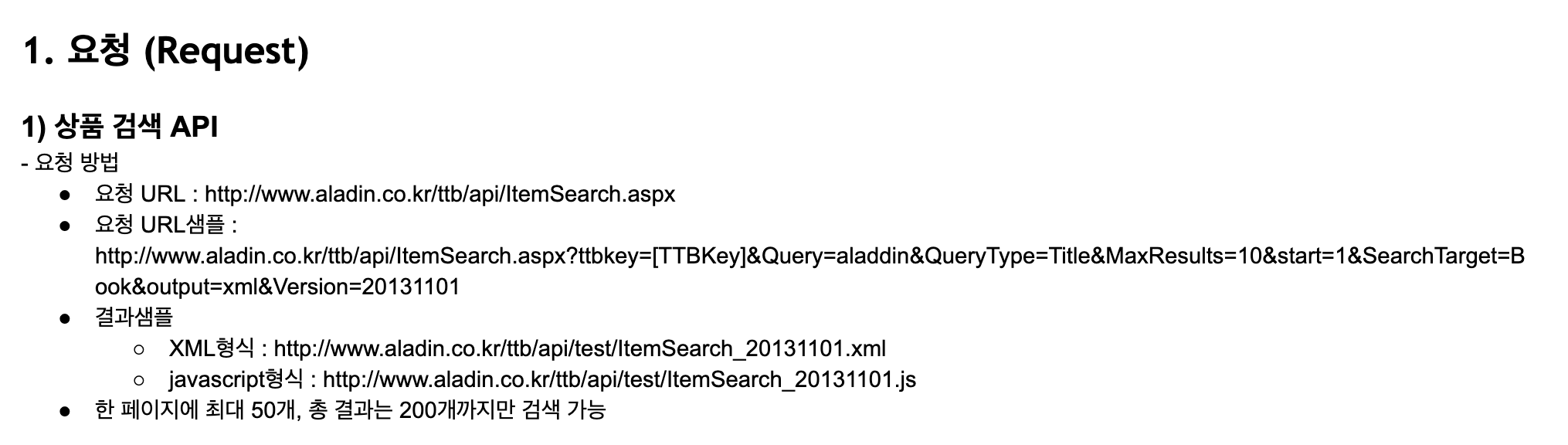 오늘은 위의 API가 구체적으로 어떤 형태를 가지고 있는지, 무엇을 요청하고 돌려받는지에 대해 조금 더 자세히 살펴보려고 합니다. 먼저 알라딘 도서검색 API를 살펴보면 아래와 같습니다.