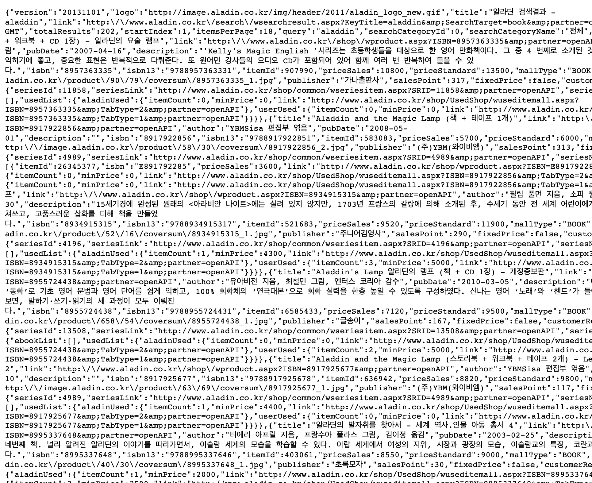 다음으로는 응답 페이지를 살펴봅시다. 알라딘이 제공하는 예시 응답 페이지는 아래와 같습니다.