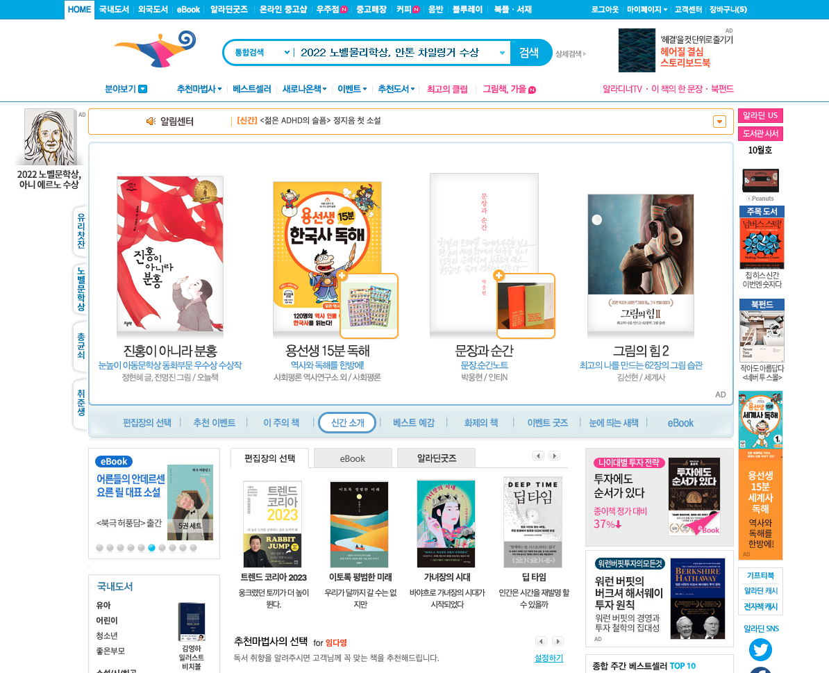 지금 알라딘 홈페이지에서 aladdin이라는 검색어로 검색 시 결과페이지와 다른 책들이 출력됨을 확인할 수 있는데요, 위의 예시 문서가 출력된 날짜가 2013년이라는 점을 미루어 볼 때 2013년 당시 출력 결과를 예시 문서로 만들어 둔 것 같습니다.